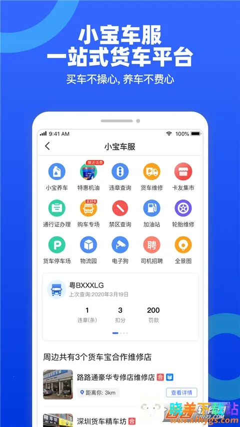 货车宝货车导航是一款专为货运司机打造的导航软件,与高德地图合作,功能齐全。它能精准定位,搜索附近加油站、维修站点和停车场,还可查询违章情况。