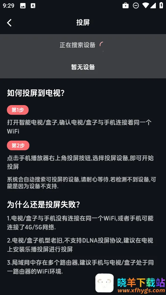 3、然后确保手机和投屏设备在同一wifi下,系统会自动搜索可投屏的设备,请耐心等待.若检测不到设备,可能是因为设备不支持。