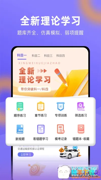 4. 全科目覆盖:题库同步交规更新,涵盖科目一至四全流程,覆盖最新交通法规、标志标线,支持多种练习方式,还有高清实操视频教程。