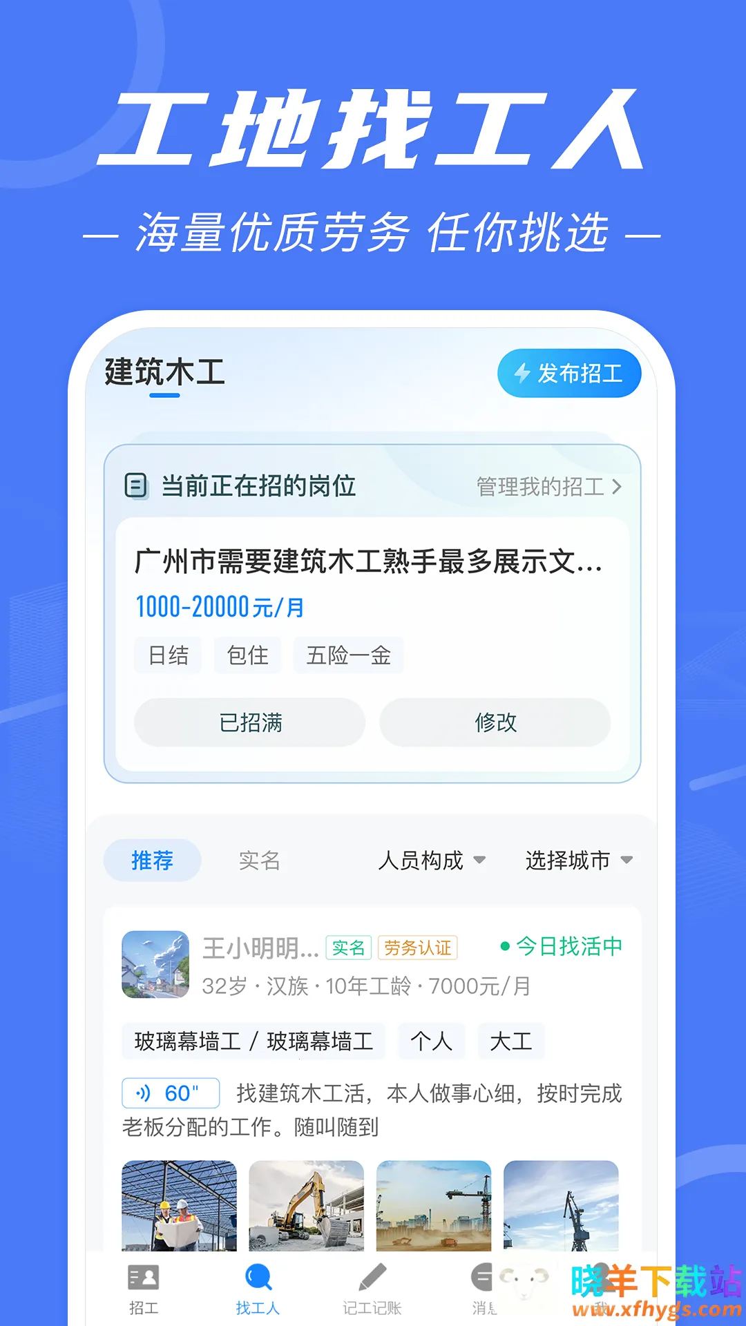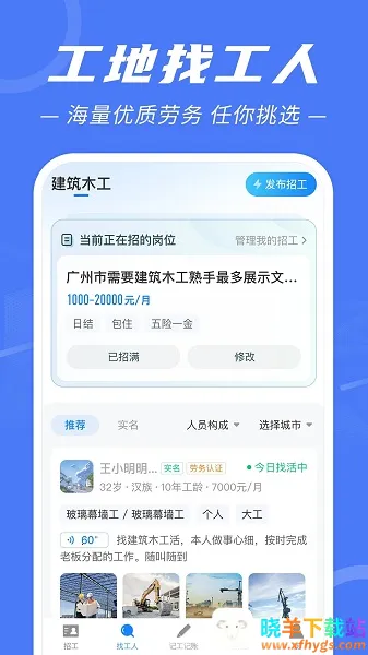 如果你想找建筑招工的途径,建筑招工APP是个不错的选择。它是专业建筑劳务行业服务的招聘平台,能满足工地招工、建筑行业找工作、工地记工记账等需求。