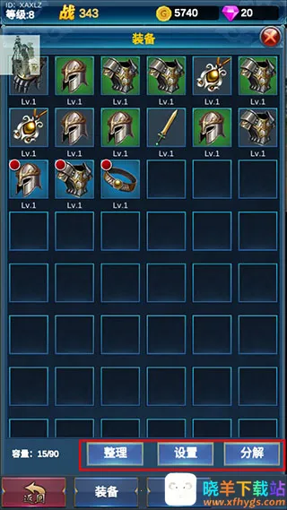 6、而点击背包则可以看到我们所获得的装备图鉴,你可以将其装备,也可以整理,更可以将其分解;