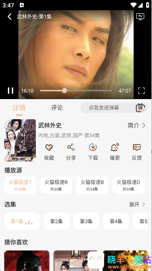 火猫影视是一款超棒的智能观影平台。它整合了全网优质影视资源,电影、电视剧、综艺、动漫啥都有。有智能推荐机制,能按你的口味精准推送。支持4K超清播放与杜比音效,看片超爽。独创追剧日历,剧集更新实时提醒。还能离线下载,多设备同步,随时随地想看就看。而且哦,它囊括全球影视资源,不用登录就能免费追剧,全程无广告干扰。播放时能轻松发送弹幕、切换画质、更换播放源、投屏及缓存影片,一点不影响流畅度。在这里,真正能零花费观看各类专属影视内容,满足你对影视的所有需求,让你尽情享受观影乐趣,完全不用担心广告打扰,赶紧来体验吧!