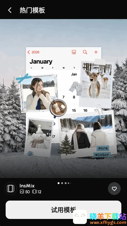 InsMix是一款独具特色的手机照片编辑软件。它无需裁剪牺牲画面细节,保留原片质感。每周更新热门模板,搭配网红贴纸、高级滤镜。能自定义幻灯片数量、画面比例等,随意叠加特效滤镜,趣味性十足。支持精细调节亮度等参数,不同用户都能修出大片。针对白色背景图片,可用橡皮擦工具快速去字。操作便捷,下载安装后跳过介绍进入主界面,选功能如模板,预览满意点击试用下载,完成后导入图片即可一键套用,满足社交平台创作需求,让照片分享更出色。