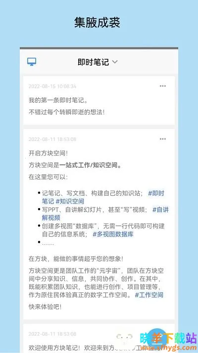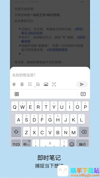方块致知灵感笔记2025官方正版是适用于办公学习的记事本软件。能随时随地记录,如会议内容等,还是阅好帮手。有自动分类等亮点,可写文件、建知识站,功能强大,简单易用,致力于打造便捷办公体验。