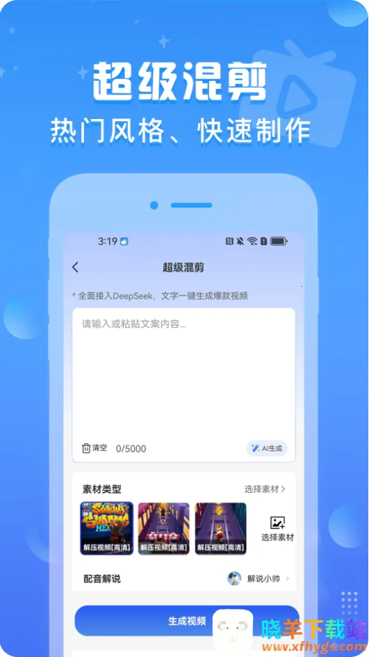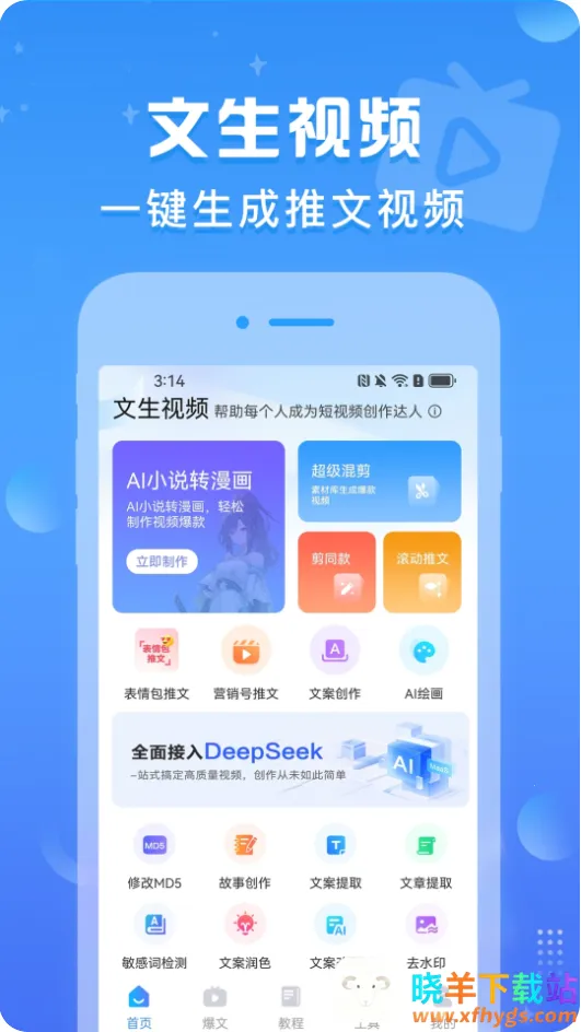 文生视频是手机视频创作软件,剪辑融入deepseek大模型,有丰富模板。导入视频可自动剪辑,支持文字转视频,无水印,有教学,支持音频导入。使用需授权限,联网调用模型,可存创作记录,会员无次数限。