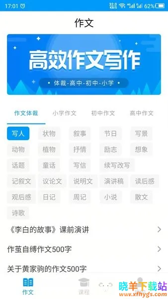 1、海量作文示例:涵盖小学到考研各阶段语文英语作文,有各年级各种写法、中考高考满分作文、真题及预测,还有专家指导,各年级单元同步。