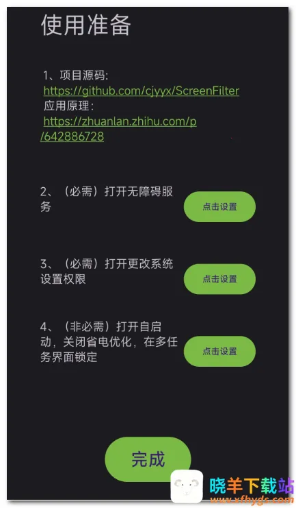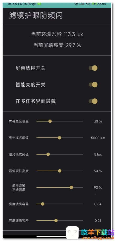 3. 环境光照变化时,会自动切换模式。光照高时自动关闭屏幕滤镜并打开系统自动亮度;光照低且屏幕亮度最低时,设置屏幕亮度为最低硬件亮度,滤镜不透明度为最高。