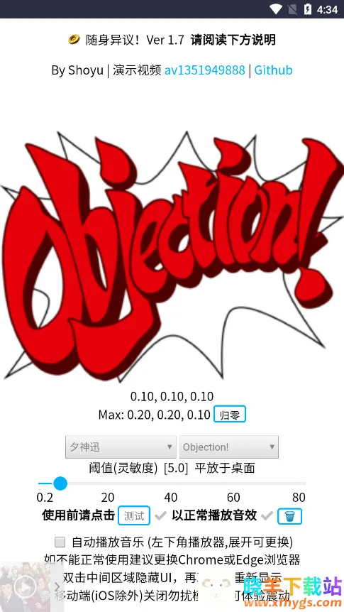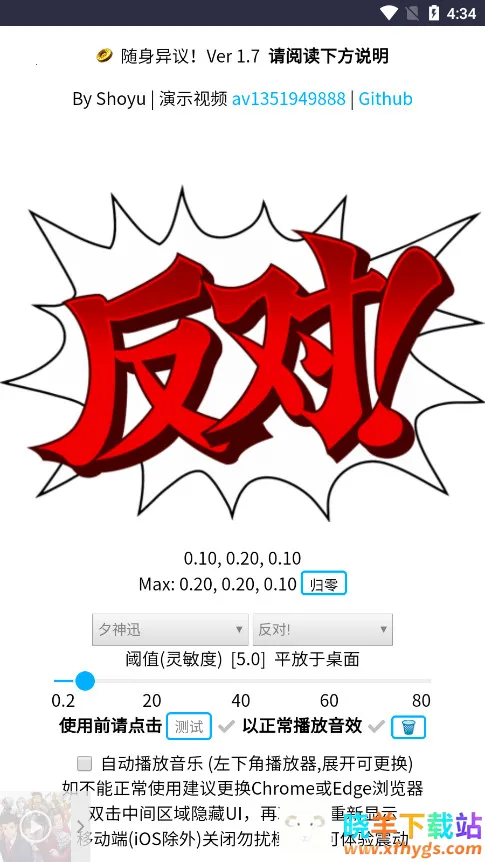 随身异议是一款超有趣的娱乐软件!它能发出反驳音效来表达拒绝,支持多语言切换。通过融合语音识别和摄像头技术,搭配角色原声效,能还原经典名场面。完美兼容各类安卓智能手机,无需担心设备适配问题。支持中日英等多语言模式自由切换,满足不同用户习惯。软件亮点众多,内置自动播放音乐功能,搭配角色音效,烘托氛围超棒。适用场景广泛,游戏聚会、日常娱乐都能带来欢乐。支持点击拍桌等多种触发方式,用户可随心选择,操作乐趣十足。还能根据喜好自定义角色声音和灵敏度。不管是社恐人士委婉反驳,还是游戏爱好者聚会娱乐,它都很合适。下载安装后,调整好灵敏度,就能轻松享受啦,让你随时随地体验别样乐趣!