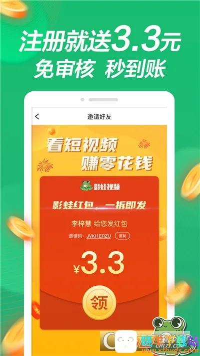 影蛙视频赚现金版是个超棒的网赚 APP!在这刷短视频就能轻松赚现金,观看时长达标收益更高。连续 9 天成功提现,还能额外得 10 元奖励!新人注册就享秒提现金特权,邀请好友双方各得 45.8 元,奖励实时到账。而且提现超简单,无门槛无套路,赚多少提多少,流程清晰透明,真正让你赚得舒心提得放心。软件里视频内容超丰富,涵盖搞笑、温情、生活记录等各种类型,还有真实多元的创作者生态,各行各业普通人的生活都在这分享。另外,它还能帮你轻松记录生活点滴,紧跟热点话题,提供创作模板。实用干货也不少,生活妙招、美食教程啥都有。下载就送 3.3 元现金,每日还有红包雨。极简安装包,省流量。想知道影蛙视频赚现金怎么提现?其实很容易,赚够钱后,在提现页面按提示操作就行啦,简单几步就能快速到账!