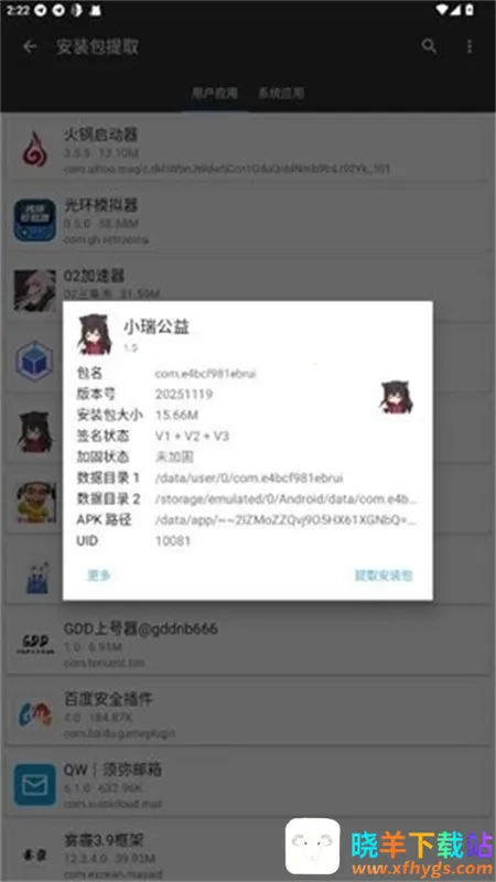 2、点击任意应用条目,即可进入详情弹窗或详情页,在这里您可以核对包名、版本号及大小等信息,确认无误后继续操作。