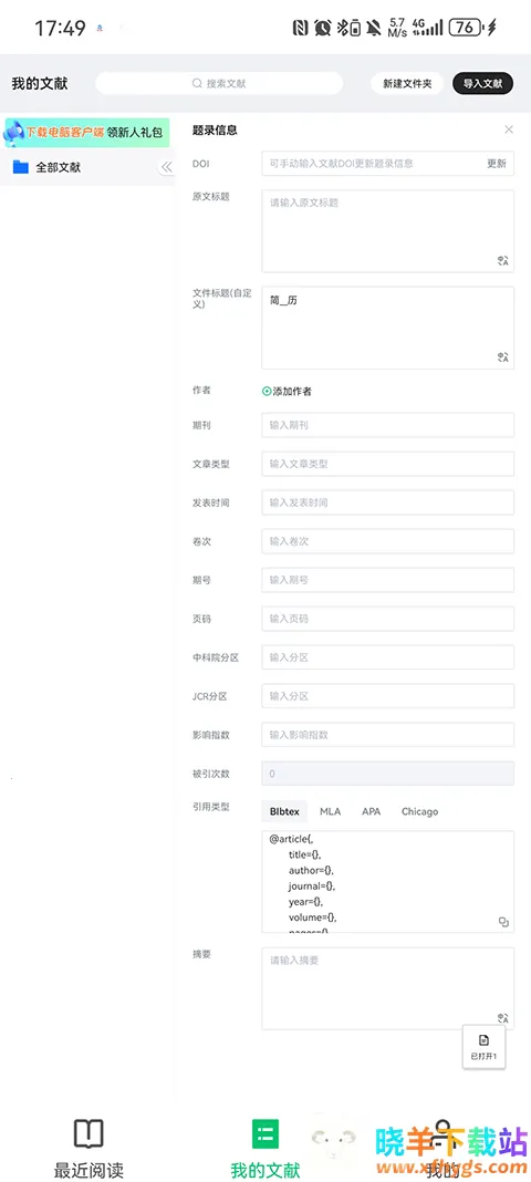 4、文献管理强:文献题录信息展示,无限级新建文件夹,管理标签筛选搭配智能搜索,精准锁定文献。