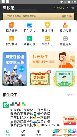 1、下载进入驾校通,在首页中可以看到有招生名片、教练会员、招生段子等功能,更有更有效的进行招生;