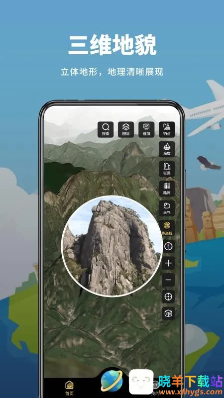 2. 可从天空观看整体三维地貌,带来独特的视角体验,助您全面了解地形。