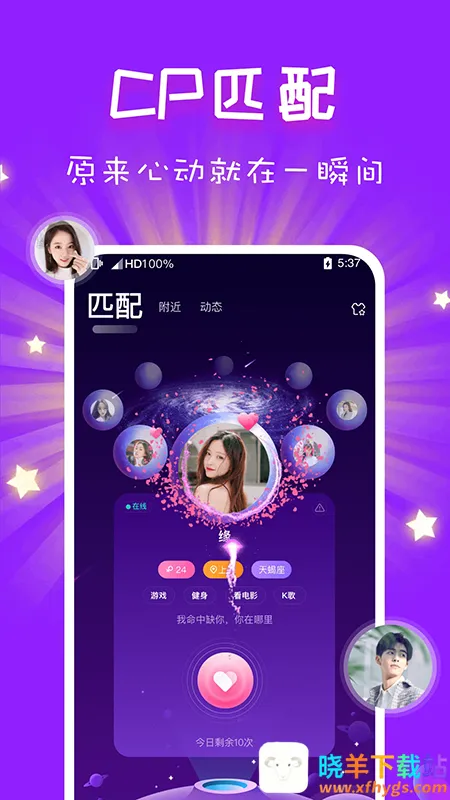 CP速配是一款线上异性交友平台,汇聚优质单身男女。专注语音交友,通过多种活动互动,还有相亲、聊天室、K歌室等。有情侣速配、个性房间等功能,能展示才华,让同城陌生人轻松遇见交友。
