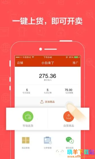 操作便捷,手机拍照即可添加商品,一键快速分享至微信、QQ、微博推广,迅速开始销售。