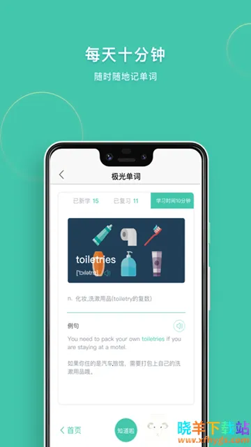 极光单词是轻课旗下的单词学习软件,有海量丰富词库,涵盖各阶段词汇。创新笃局模式,对赌背单词可返现。还有多种学习功能,如场景记忆、智能复习等,助用户高效记单词,解决背单词难题。