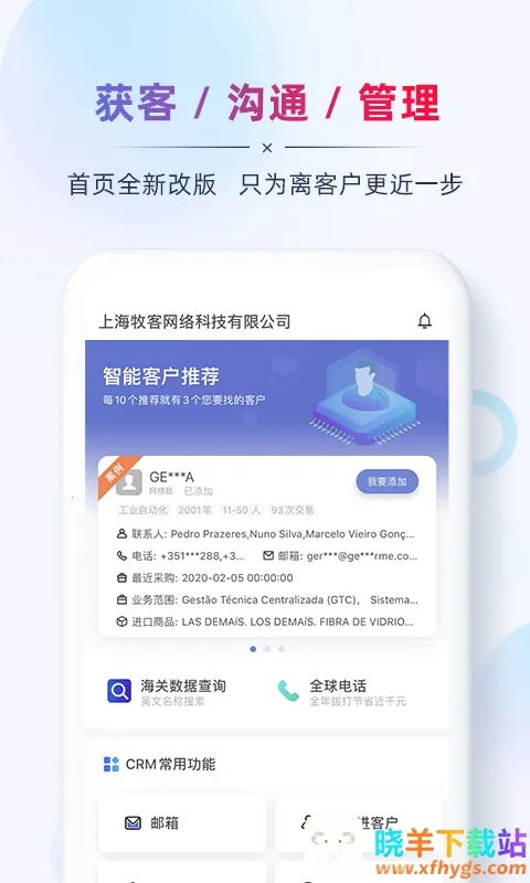 在功能方面,它具备全球电话、销售业绩、邮件管理等实用功能。全球电话可拨打全球电话找国外客户;能看到详细销售业绩信息;新邮件自动通知并管理。还可进行客户推荐、查看海关数据、反馈意见、管理客户信息等。