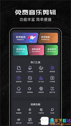 音乐剪辑助手App是长沙小尹信息科技有限公司旗下的音频编辑软件,功能超全面,支持音频剪切、混合、合并、格式转换等,操作简单,能满足日常需求,新手也能轻松上手,剪出喜欢的音乐。