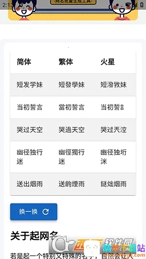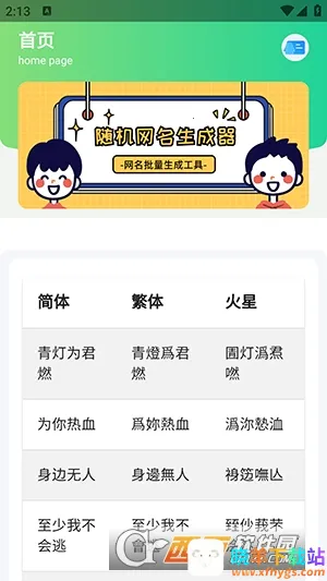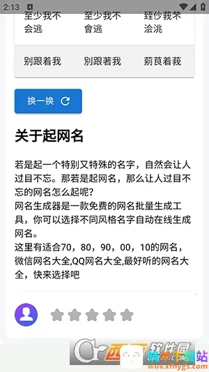 其特色也十分突出,网名风格丰富,还能推荐搭配主题。你能依据自身喜好和审美来挑选网名,整体界面简约,能让你快速找到所需板块。操作更是简单易懂,可以按需求生成网名,不满意还能重新来。软件还会根据你的喜好或浏览习惯推荐相关网名,不同风格带来不一样的体验。选好喜欢的网名后,直接复制粘贴到其他平台就行,轻松打造个性化网名。