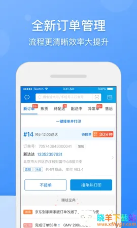 京明管家商家安卓版是京东为商户开发的软件,页面简洁易操作。商家能通过它接收处理订单等,未来还会有更多实用功能和数据信息,助商家轻松做生意,如支持手机接单、多门店管理等。