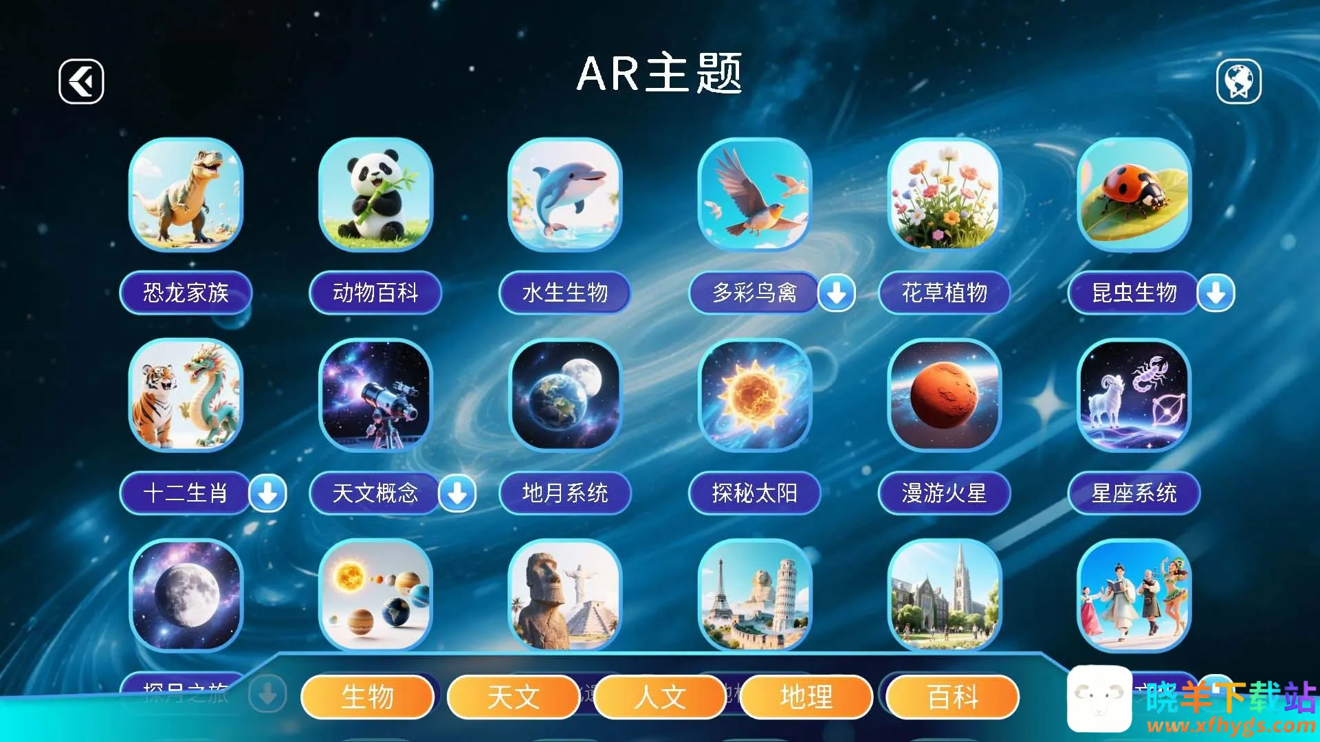 万象地球是一款将传统地球仪与现代科技相结合的智能地球仪应用。其 AR 版块有全球三十个精选主题,涵盖著名建筑、远古恐龙世界、天文和自然奇观等。下载安装也十分简单,点击下载 app 并安装,完成后直接打开进入主界面,里面有 AR 互动、VR 体验、主题探索和设置中心等主要板块,点击对应图标就能进入相应内容。在主题中心选好感兴趣的内容,点击进入会有文字说明、语音讲解和 3D 模型互动。使用过程中,每个主题都有趣味问答环节,能测试对建筑、动物和地理知识的掌握,增添学习趣味性。遇到喜欢的内容还能收藏或做标记。现在就下载,开启惊喜的沉浸式体验吧!
