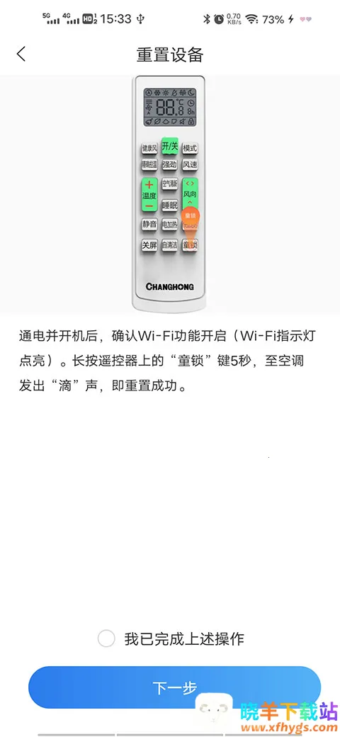 4、将空调通电并开机后,确认Wi-Fi功能开启(Wi-Fi指示灯点亮)。长按遥控器上的“童锁”键5秒,至空调发出“滴”声,点击下一步。