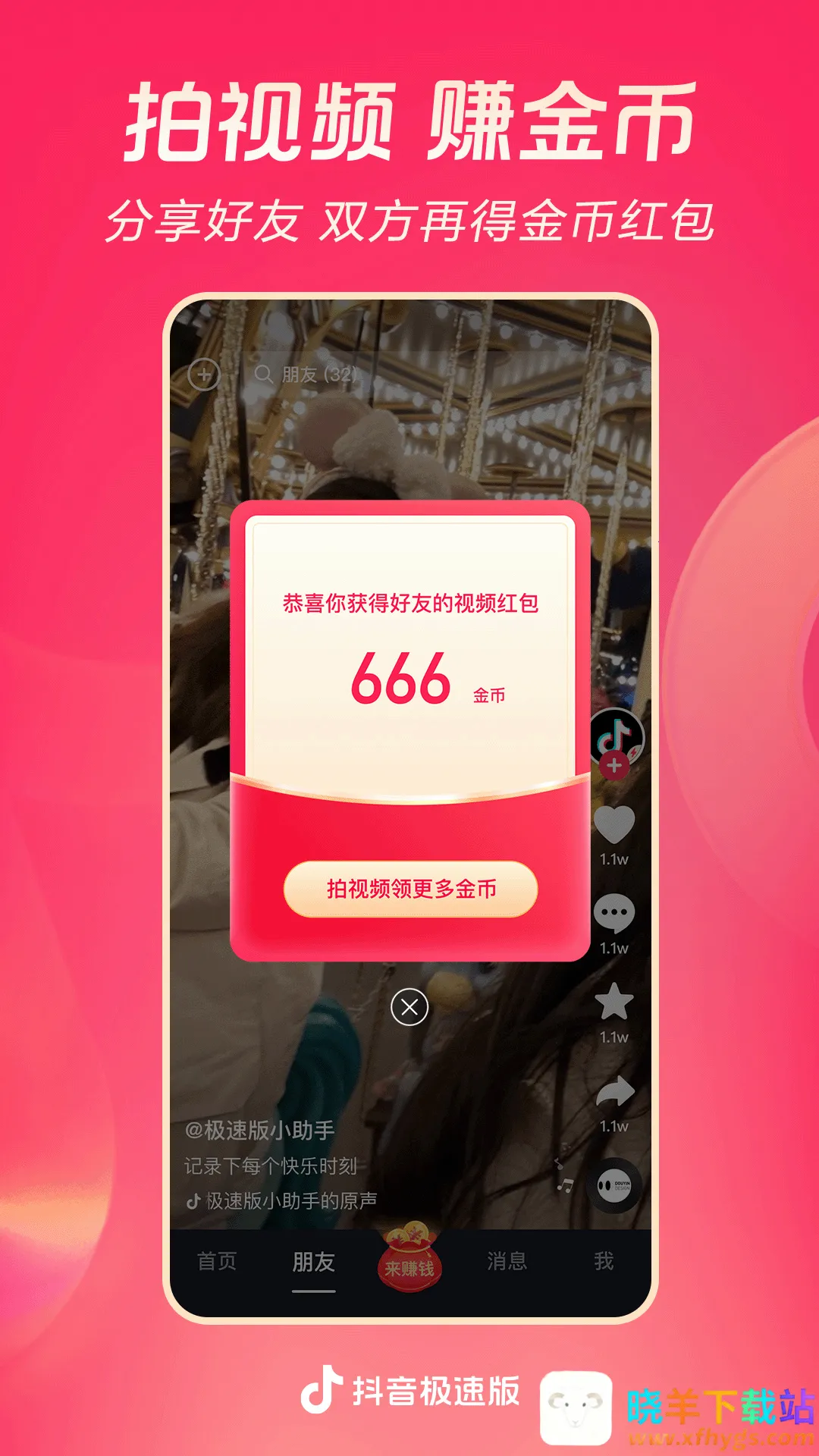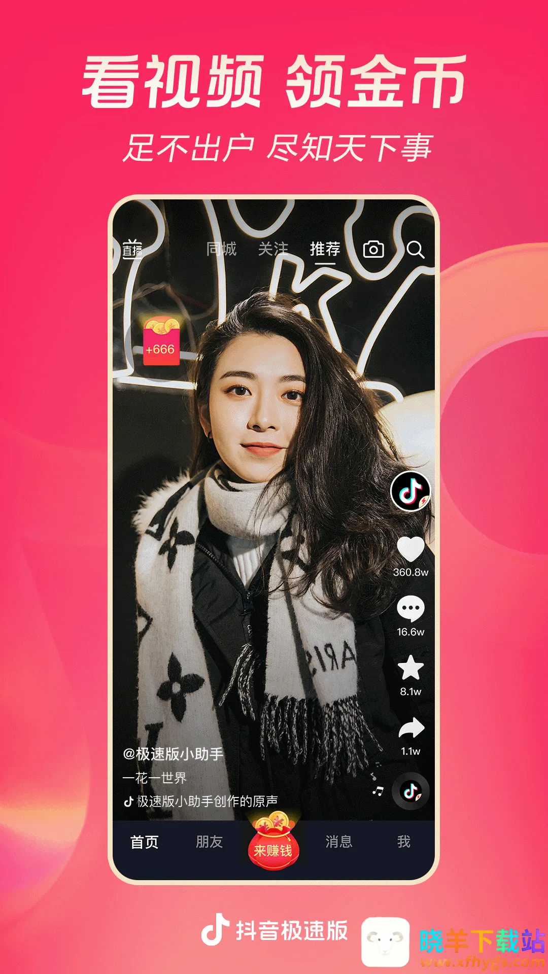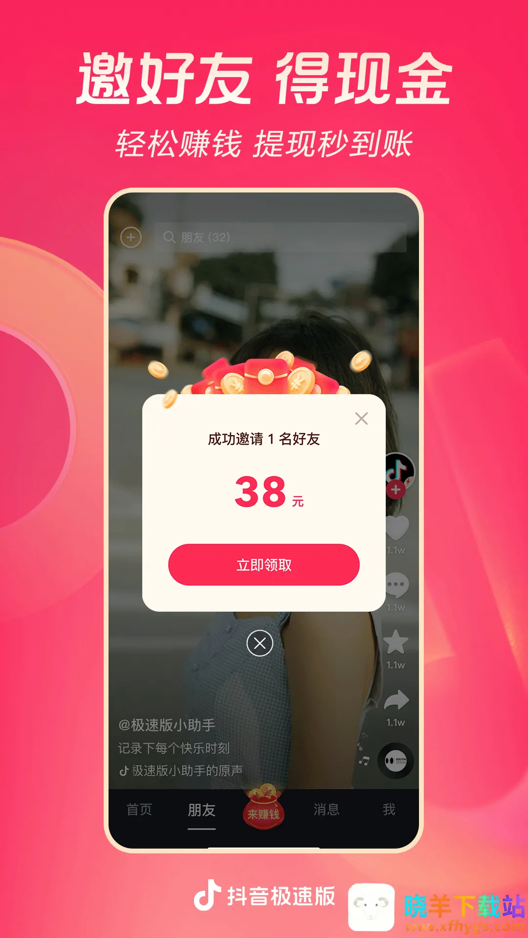 想知道怎么通过极速抖音短视频赚钱吗?其实很简单!首先,刷视频就能赚金币,每天凌晨金币会自动兑换成现金,兑换比例受每日广告收益影响会有浮动,大概是10000:1 。其次,邀请好友也能赚钱,将软件分享给好友,好友通过链接下载注册,首次邀请立刻得2元奖励。好友每天看视频,你能获得3 - 4元奖励,累计3天得10元,好友看视频获得的金币,你还能得双倍,累计可达26元。每天只可提现一次,一次最高30元。极速抖音短视频内容丰富多样,和抖音同步更新,能满足你的娱乐需求。而且安装包小,运行流畅,操作简单,各年龄段都方便使用。有了它,一边刷视频一边就能攒零花钱啦,赶紧试试吧!