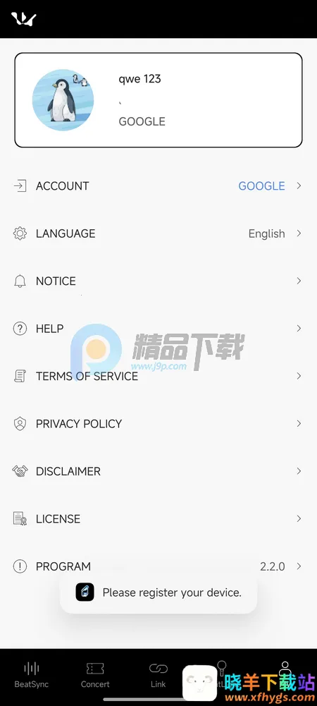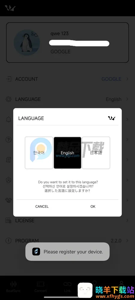 使用时,先同意软件政策,选择谷歌登录,打开手机蓝牙,通过蓝牙连接应援棒即可操控。改语言也很简单,点击“我的”,再点“language”,点击修改就能完成。