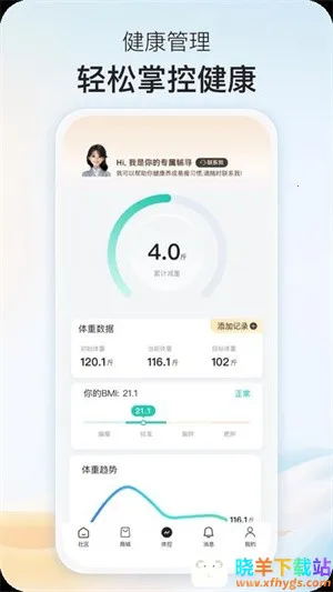 4、健康生活化:专注于健康生活化控体,让你将健康融入生活,科学、轻松又快乐地达成理想体态,培养健康可持续的饮食与生活习惯。