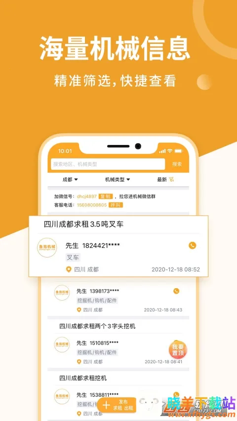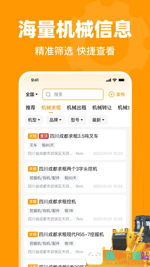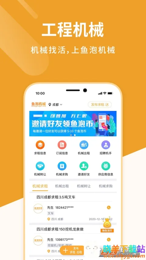 鱼泡机械是成都鱼泡科技有限公司开发的工程机械租赁软件,提供挖机等多样设备租赁及二手交易。有行业资讯,专属客服,支持定位推送附近设备,能发布求租、出租等信息,方便建筑工人找靠谱机械。