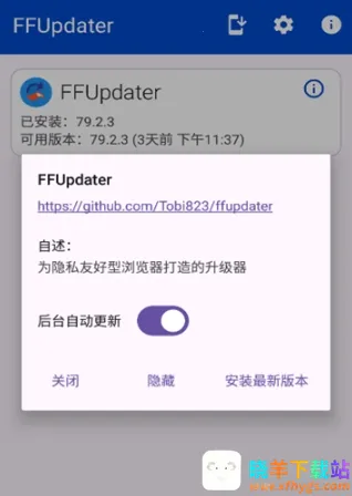 FFUpdater是移动端Firefox浏览器更新工具,能自动查新版本,无需手动升级。还收录其他浏览器安装包。界面简洁,功能多样,可在线搜索项目,命令行易上手。能后台自动更新,保留书签等,升级包安全稳定。