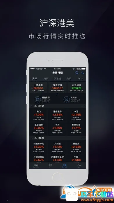 3. 全市场行情实时播报:在行情板块,可查找沪深港股、环球和中国概念股分类,详细查看每支股票的实时价格、涨幅、成交量、新闻公告和调研报告等信息,还能了解全球各大著名指数走势。