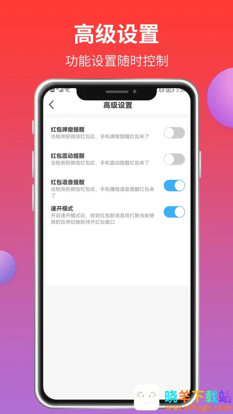 1. 高级模式多样:拥有多种高级模式设置,可轻松开启红包弹窗、震动、语音提醒等操作,满足全方位提醒需求。