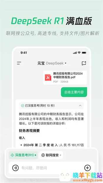 腾讯元宝手机版是一款功能强大的AI智能助手软件。它依托混元大模型和DeepSeek - R1联网满血版双引擎,能快速准确地回答各种问题。其涵盖多种实用功能,如文档总结、AI作图、口语陪练等,满足办公、学习、创作及生活等多场景需求。