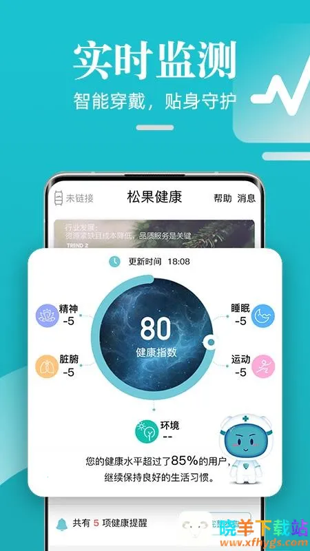 松果健康是北京正气和健康科技有限公司开发的健康管理软件,配合智能手环使用,可实时监测身体数据,如睡眠、心率等,还能提供风险预警、预约咨询、健康任务等功能,以及科学运动饮食建议。