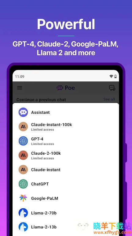 poe是一款极为火爆的AI社交聊天软件,全称叫做POEFastAIChat,在该平台当中能够为用户带来与众不同的AI聊天体验,并且还支持文章生成,帮助用户更好地进行聊天。软件的UI设计简洁美观,让聊天变得更加有趣个性化。用户可以轻松地与AI进行互动,享受智能化的聊天体验。内置了先进的自然语言处理和机器学习技术,能够快速理解你的问题,满足不同人群的使用需求。软件特色1用户加入到其中可以自定义聊天的样式背景表情等,进行个性化社交聊天设置。2Poe系统当中,你可以智能的去提醒用户重要事项,帮助用户不错过任何重要事情。3社交聊天系统响应用户输入快速,以便能高效地生成回复,能够更高效地进行聊天。软件亮点1Poe软件提供多样化的聊天功能内容,让用户都可以根据喜好选择不同的聊天方式。2支持多种语言之间的实时翻译社交聊天,方便直接与来自不同国家的朋友进行交流。3提供多种趣味互动社交聊天功能,语音变声图片滤镜小游戏等,增添聊天乐趣。软件优势1采用深度学习技术,更准确地识别用户意图和情感,生成符合需求的社交聊天回复。2Poe的ai用先进的自然语言处理技术,能够自动识别用户输入,并生成更自然的回复。3通过兴趣爱好和行为习惯社交聊天,推荐相关的聊天话题和内容,更容易有话题。PoeFastAIChat使用教程1在本站下载PoeFastAIChat,安装以后打开应用。2在使用之前大家需要进行注册邮箱,支持QQ邮箱,输入验证码。或者使用谷歌或苹果账号直接登录3打开电子邮箱,复制验证码,粘贴到Code处,点击Verfy。4注册成功后,即可免费使用,显示一共支持7款智能AI机器人,包括GPT-4。5点击任意一个免费的机器人即可使用,收费的机器人也可以使用但是有使用限制。6使用受限的主要是GPT-4和Claude。软件点评poe是一款提供智能对话功能的软件,你可以与最新的智能聊天机器人进行交流,并获得智能回答和解决问题的帮助。软件还内置了先进的自然语言处理和机器学习技术,使得它能够理解用户的问题,并以智能流畅的方式回答,使用的次数越多,该智能AI就会越懂你。