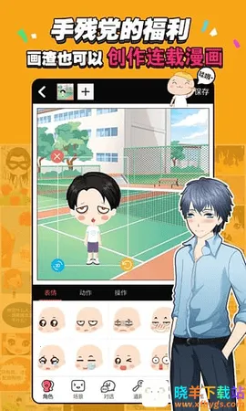 3. 自由创作:全自由创作模式,可依自己的故事挑选场景、人物、动作、表情、服装、道具等素材随意拼组,能创作多格漫画及长篇连载漫画。