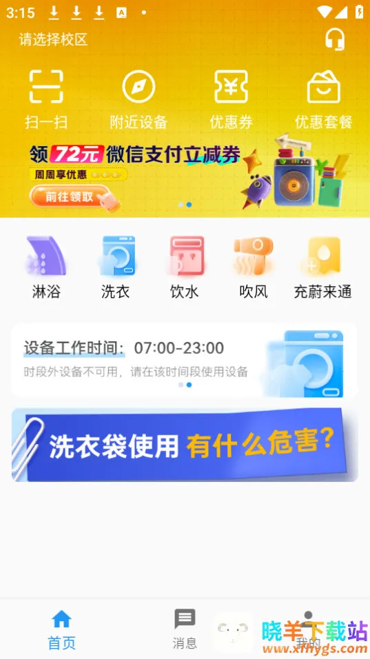 蔚来校园致力于为校园经济注入新的活力,让洗衣不再成为烦恼,每位学生都能轻松享受便捷的洗护体验。它是一款专为在校学生设计的智能洗衣服务平台,简化日常洗护流程。用户可以通过应用快速找到附近的洗衣设备,并实现在线支付与远程监控。利用现代二维码技术,传统的投币洗衣机得以升级为便捷的在线支付模式,大大提升了使用效率。这款app不仅满足了学生对于生活便利的需求,还通过数据监控优化设备配置,保证资源的高效利用。如果你正在寻找一种新方式来管理洗衣,那就赶快下载体验吧!