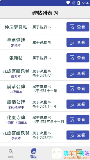 1. **丰富碑帖资源**:提供丰富碑帖,包含仲尼梦奠帖、九成宫醴泉铭等众多经典,共8个碑帖,194张碑帖图片及6094张单字图片,让用户可欣赏更多经典书法。