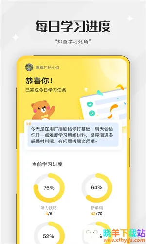 4. 科学课程体系:学习听力技巧分级测试,匹配适宜的听力内容,读音讲解从单词到长难句逐步拆解,帮助用户稳步提升英语听力水平。