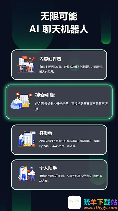 Chatbot AI最新手机版以GPT-3等模型驱动,主打智能对话与个性化交互。免费使用,功能丰富,能应对各类问题,理解上下文,实时交互自然流畅。依托大模型,界面简洁,不收集数据,适配不同需求,多场景支持,还能语音输入。