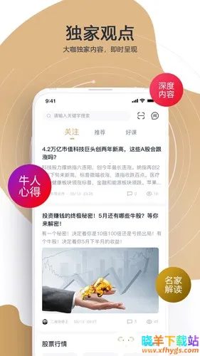 财乎是专注知识分享的互联网平台。它特色鲜明,能为用户带来诸多价值。这里有丰富的资讯热点,助你快速了解信息。小视频形式让你轻松知晓精彩财经信息。课堂学习可快速提升能力,学到更多知识。直播窗口能及时呈现新闻趣事。你还能关注名家,实时沟通获取财经商业知识。在线咨询问答,帮你快速解决问题。其功能多样,直播支持回放,圈子可互动交流,课程能自主上传,问答付费围观有收益。在多类终端均可使用,行情快讯精准送达,无论是投资者还是知识分享者,都能在此收获满满。