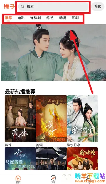 下载安装并打开橘子影院app,进入首页后可以直接搜索想看的影视,