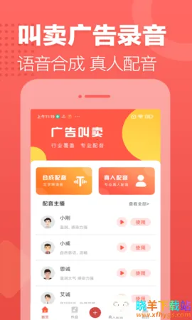 广告叫卖录音是合肥名阳信息技术有限公司打造的录音软件,支持文字转语音,有海量配音主播。适用于多场景,操作简单,能中英文切换、选发音人,可导出文件、蓝牙播放,还能添加背景音乐,已修改已知Bug优化体验。