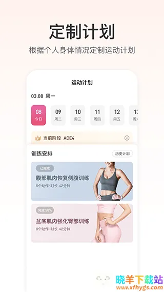 2、提供个性化训练计划,系统依据用户体质与目标,如减脂、增肌、塑形等推荐方案。