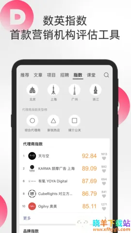 2. 专业评估指数:基于多维度数据综合得出数英指数,其中代理商指数可评估综合实力,品牌指数能量化品牌在创意营销层面的表现,为行业提供专业参考。
