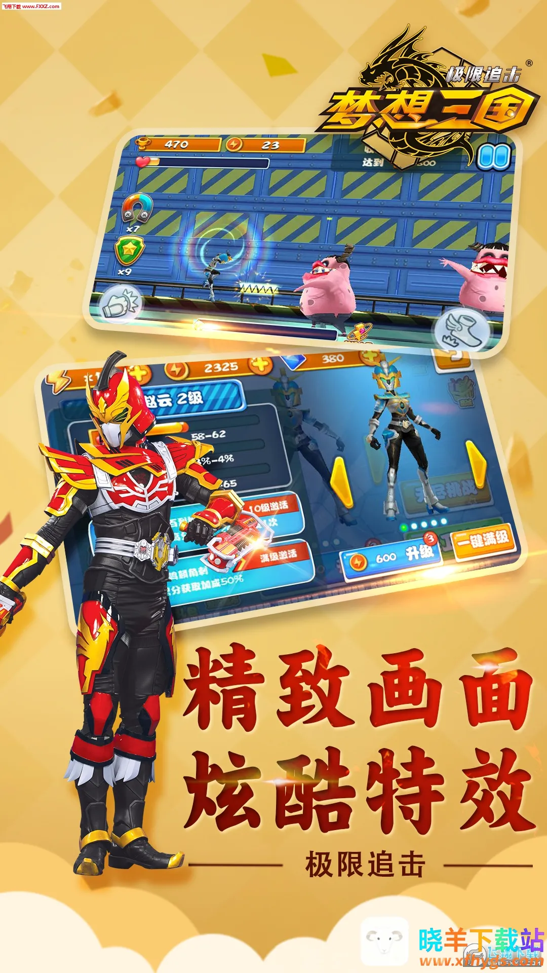 《梦想三国极限追击》是一款超有趣的游戏!它是基于梦想三国IP正版授权的3D横版动作冒险游戏。在这游戏里,你能化身帅气的三国传奇英雄,去争夺梦想之力。玩法很简单,在关卡中不断跳跃躲避障碍,消灭怪物就能获取金币。通关还能得到奖励,提升角色各种属性呢。游戏场景简单清新,角色躲避障碍完成难度会加分。它把跑酷和格斗完美结合,有高清3D视觉,品质超棒。还有炫酷机甲三国剧情人物,颠覆传统设计。搭配生动的背景音乐,让你体验热血沸腾的格斗跑酷之旅。新奇的怪物造型、原声配音音乐、酷炫打击特效,以及各种还原的原作设定,带你进入梦想三国的神奇世界。不管你是想找点刺激的冒险,还是享受轻松的跑酷体验,这款游戏都能满足你,快来试试吧!