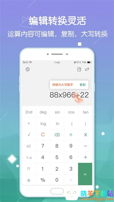 2. 功能丰富:支持阶乘、角度制和弧度运算、平方运算等,同样支持历史记录、大写转换、语音报数、再编辑功能,支持公式运算、对数函数、幂函数、三角函数、反三角函数等科学计算。