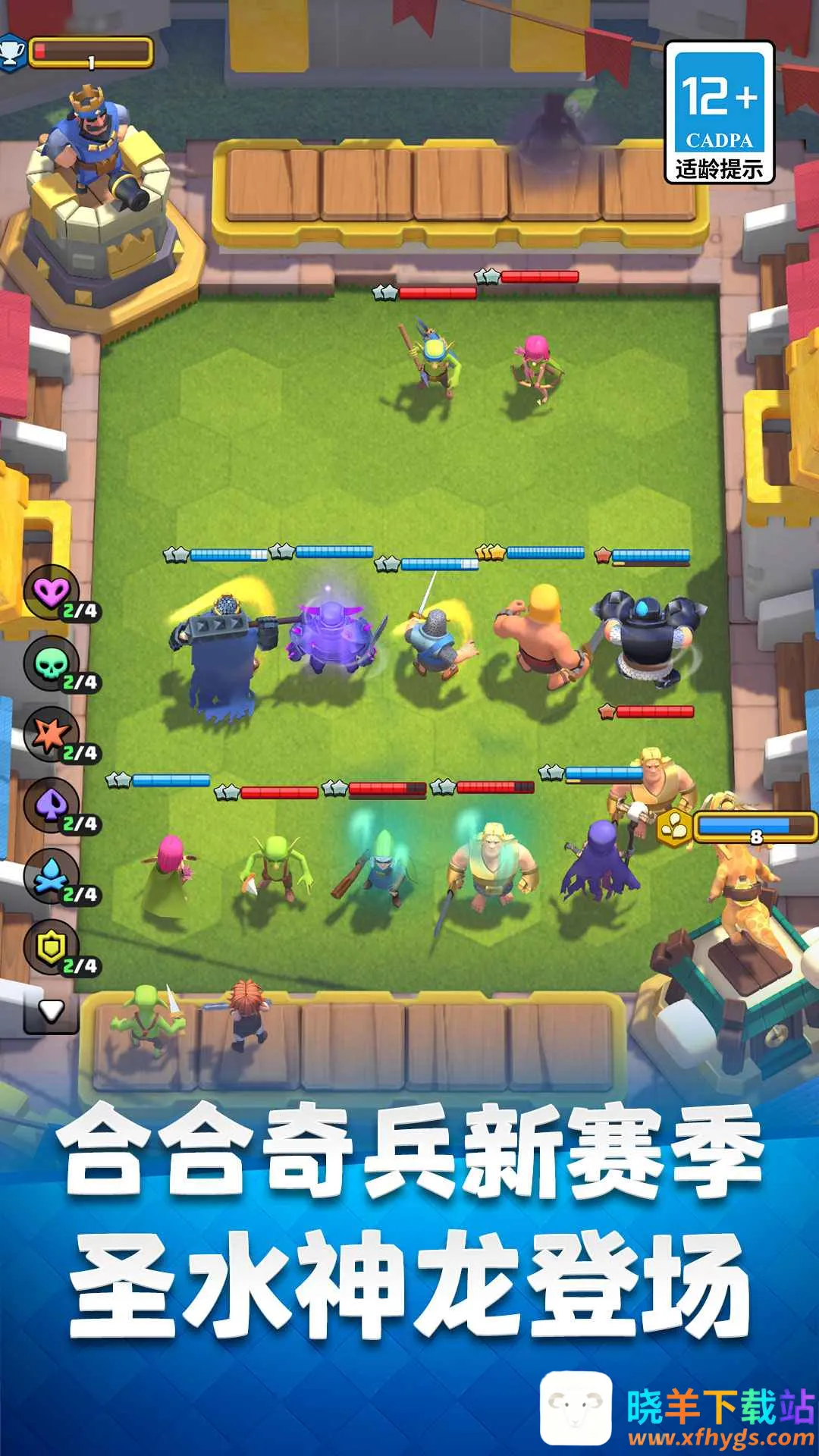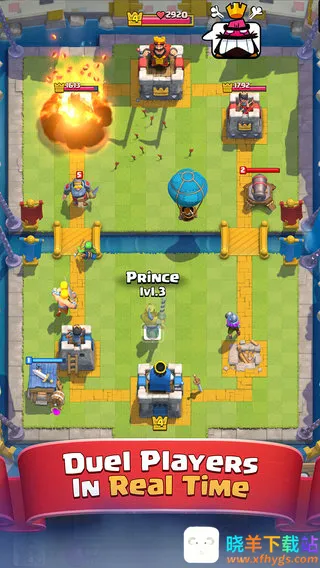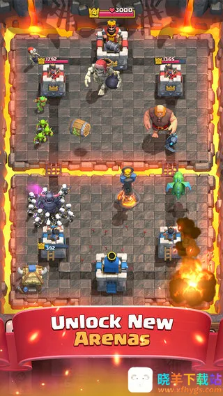 4. 丰富玩法:解锁宝箱获新卡并升级现有卡牌,摧毁对方皇家塔赢皇冠,在各级竞技场挑战登巅峰。