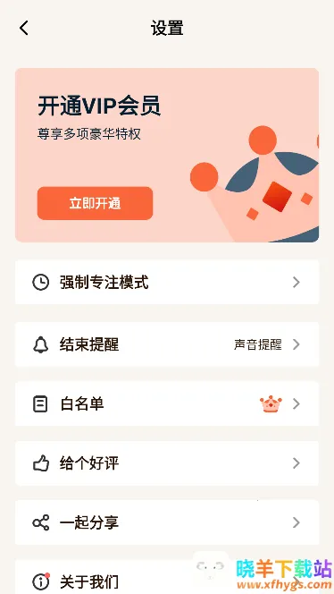其界面设计简单清爽,操作便捷。煮面界面中,不同时间对应不同面条,点击开始专注即可。开始后10秒内可取消,之后取消算失败。旁边的面馆能查看专注时长和累积时间,除前两种面条免费,其他需会员或看广告解锁。设置里可开启强制专注模式,添加白名单。